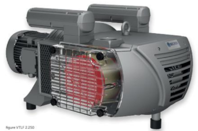 Oil-less rotary vane vacuum pump with carbon vanes, built-in suction filter with clear cover, integrated check valve, vacuum regulating valve, blow-off valve/silencer.